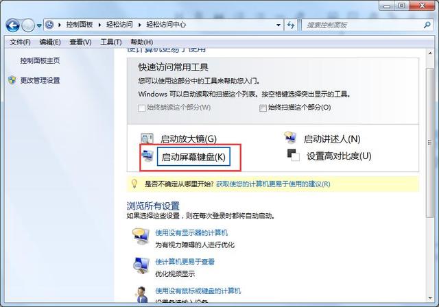 - 进入轻松访问中心我们可以看到这里有很多方便的小工具,大家没事的时候可以自己研究一下。在这里我们可以点击“屏幕键盘”,那么系统自带的软键盘就可以使用了。我们可以用它临时处理一些没有完成的任务,在使用结束后再专心的寻找键盘失效的原因。