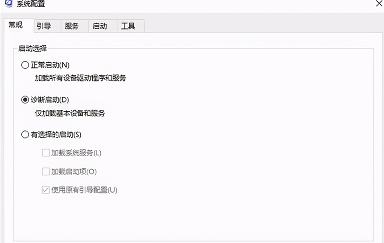 黑屏的时候只有鼠标,我们可以尝试一下键盘上“Ctrl+Alt+DEL”组合键,调出任务管理器,点击“文件”,运行新程序,输入“msconfig”命令并回车确定弹出系统配置界面,在常规的选项卡中,我们点选“诊断启动”,并点击确定,因为大多数的黑屏基本是Windows中某个服务导致的这个问题,重启电脑就可以解决黑屏只有鼠标指针的问题了。