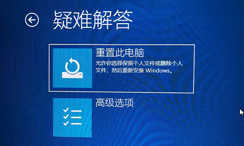 如果不行的话,也可以在以上的步骤4中,在疑难解答界面,选择“重置此电脑”选项,重置一下电脑。(重置此电脑可能会进入两个选项,一个是保留我的文件,一个是删除所有的内容,我建议是保留我的文件,点击“本地重新安装”按钮。)