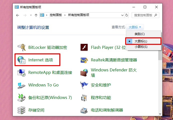 2、进入控制面板后,将“查看方式”修改为“大图标”,接着找到并点击“Internet选项”。