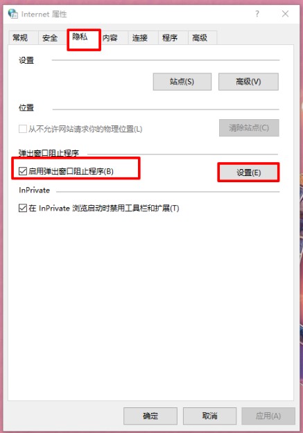 3、在Internet属性界面中,点击“隐私”,勾选“启用弹出窗口阻止程序”,再点击“设置”。