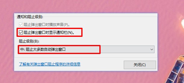 4、勾选“阻止弹出窗口时显示通知栏”,然后将“阻止级别”修改为“中:阻止大多数自动弹出窗口”即可。