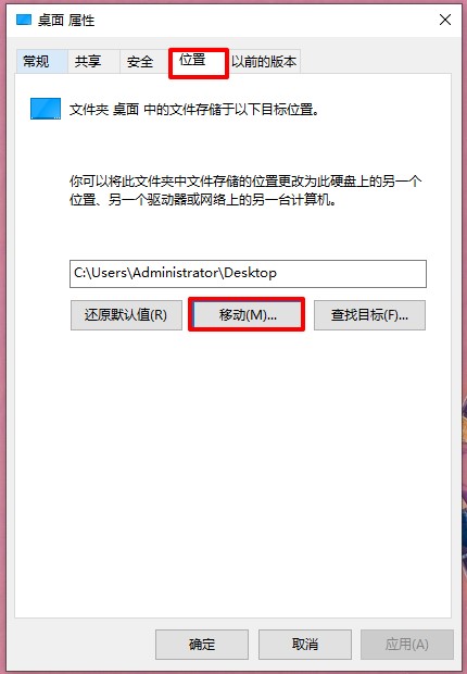 2、在属性窗口中,单击“位置”选项,点击“移动”,将存储位置选择在除系统盘以外的其他分区中就可以了。