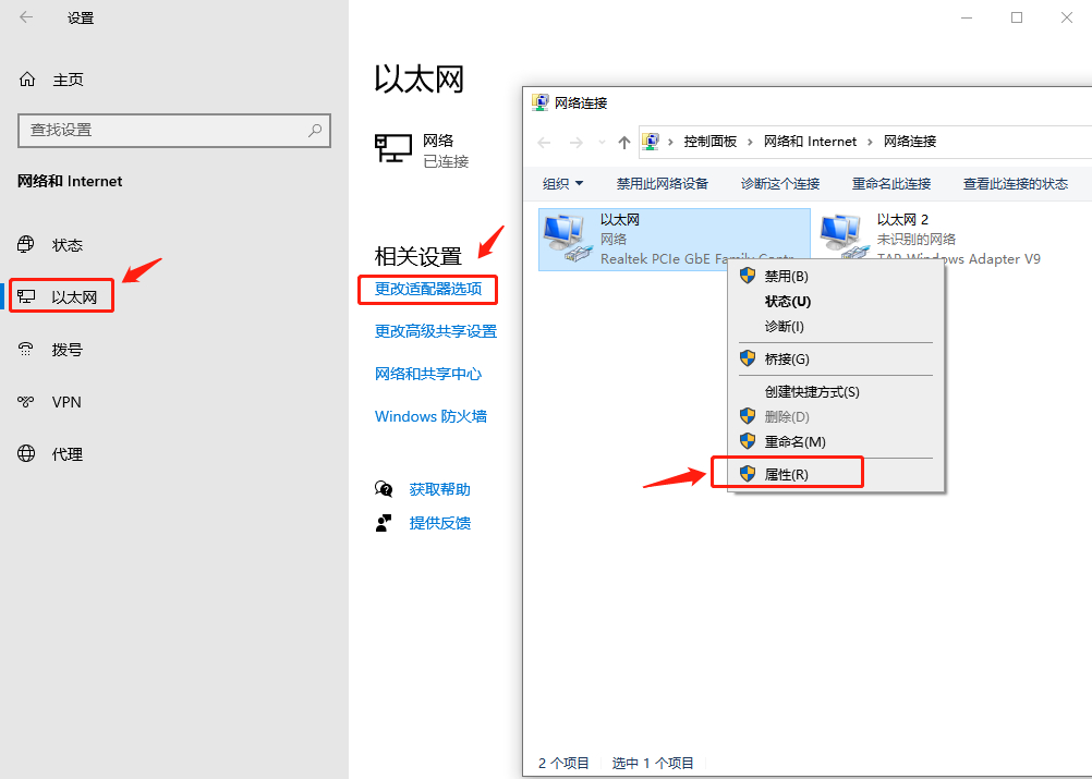 解决方法:点击【设置】→【网络和Internet】→【以太网】→【更改配置器选项】→右键单击当前正在使用的网络,然后选择【属性】