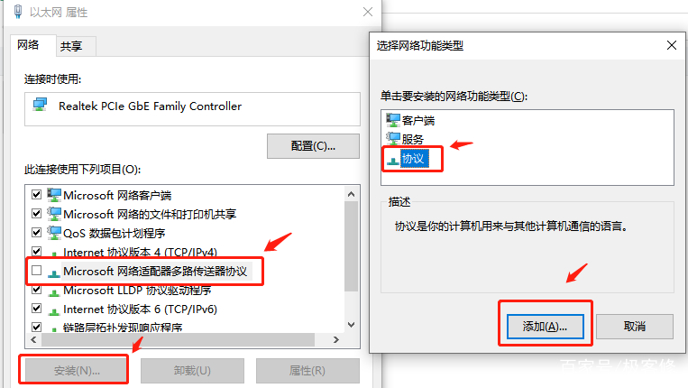 单击选中【Microsoft网络适配器多路传达器协议】,然后单击【安装】,在出现的窗口中选择【协议】,然后单击【添加】,然后重启电脑就可以上网了。