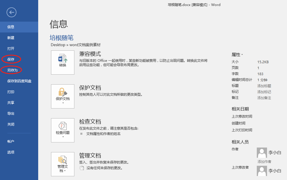 对Word文档进行修改后,如果执行“文件”-“保存”命令,可以直接在当前文档中保存所作的修改,文档名称仍是修改之前的名称,文档存放位置仍是修改之前的位置。