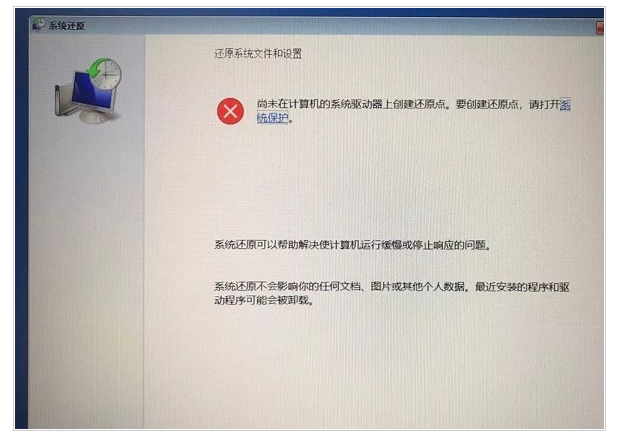 注意:如果出现下图提示,说明之前没有设置过还原点,无法通过还原点还原系统。这样的话就需要重装系统了!