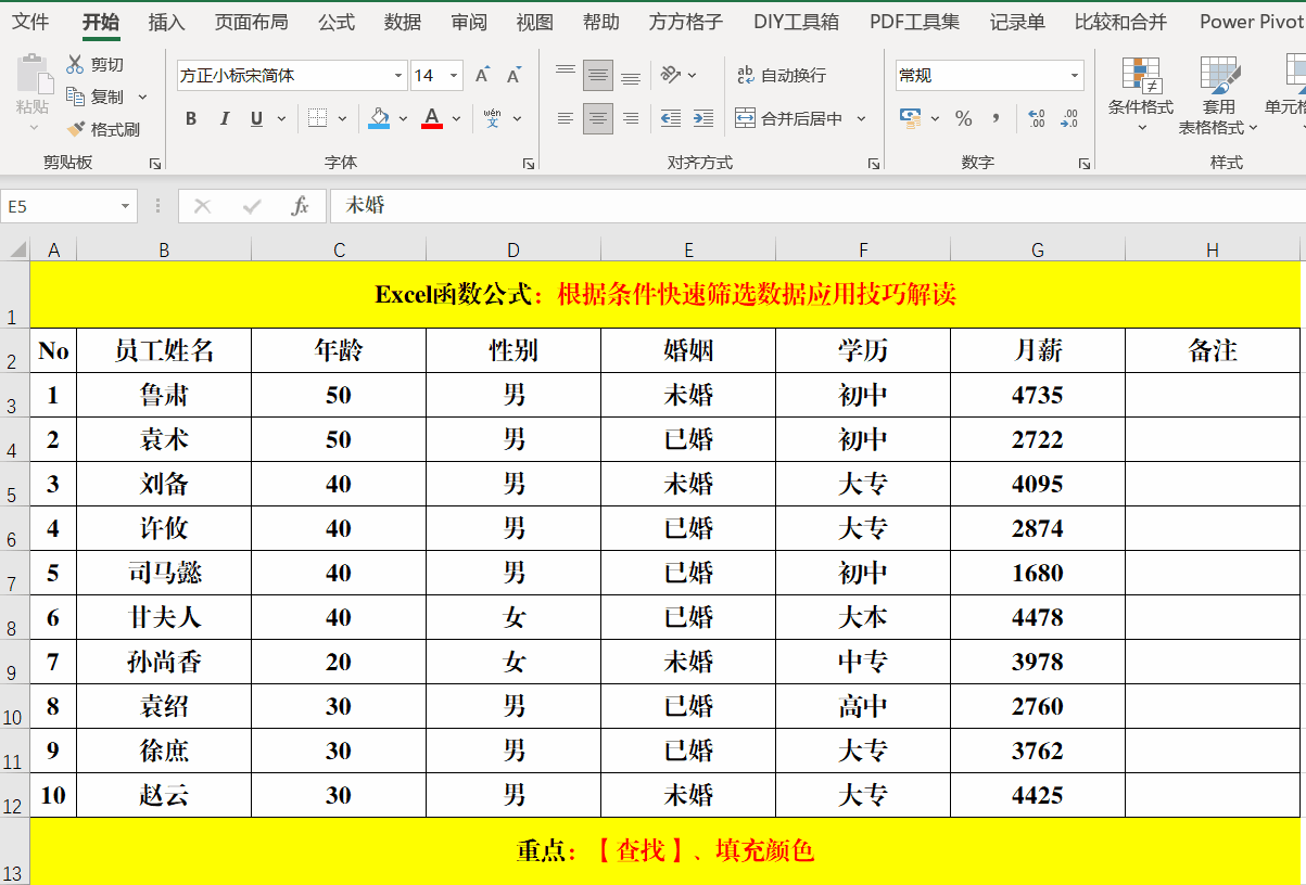目的:将【婚姻】状态为【未婚】的信息填充为蓝色。