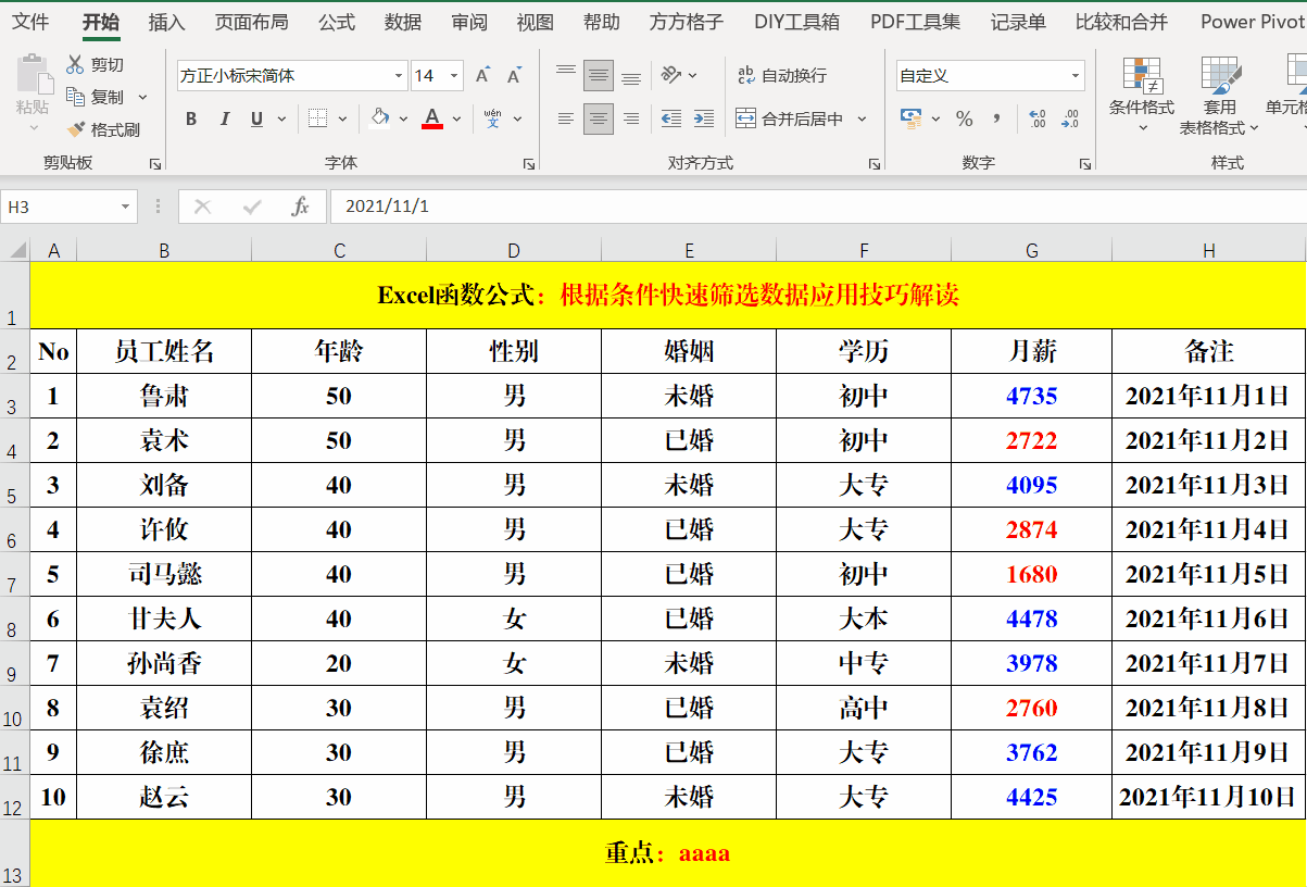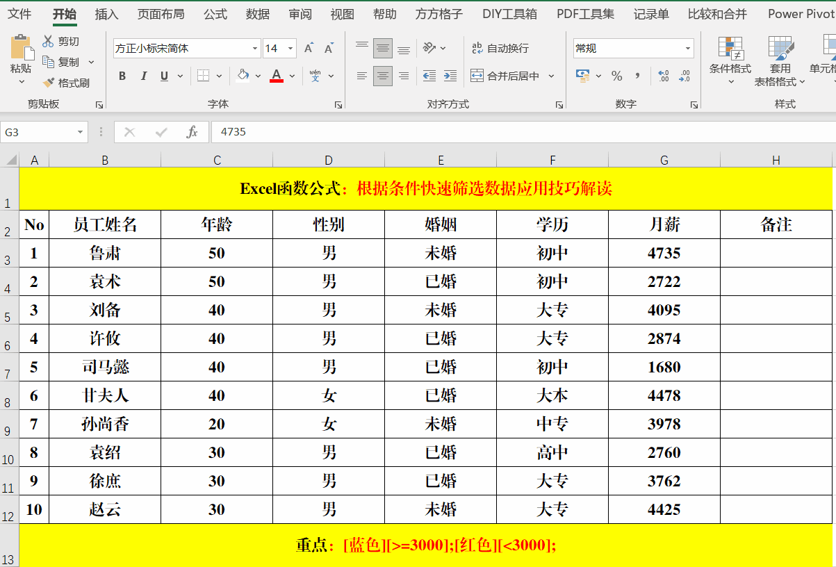 目的:将【月薪】中≥3000的标识为蓝色,<3000的值标识为红色。