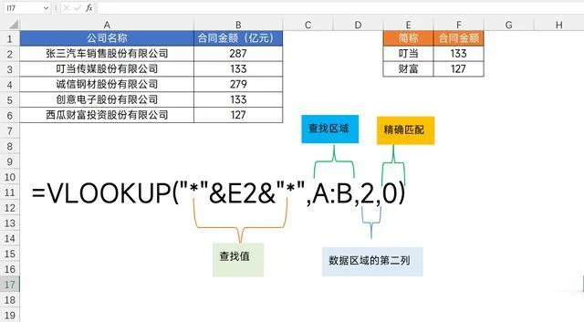比如在这里我们想要通过简称叮当与财富在左侧的表格中找到它对应的合同金额,这个时候只需要将函数设置为:=VLOOKUP("*"&E2&"*",A:B,2,0)即可
