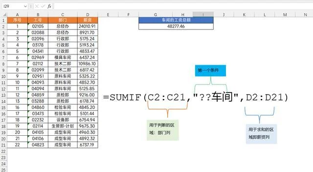 第一参数:C2:C21,条件区域,就是部门这一列数据第二参数:??车间,我们利用通配符构建的条件,代指所有的车间第三参数:D2:D21,实际的求和区域,这个公式也非常的简单,它就是一个sumif函数的普通应用,它的第二参数我们还可以设置为[*车间]或者[*车间*]这个条件的构建是非常自由的,只要你能准确的表示想要统计的条件都是可以的。