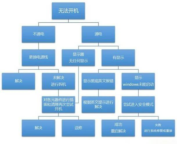 如果你的电脑出现了无法开机的情况,那么就照着这个检修流程图一步一步走下去,基本都能解决问题。当然,在处理电脑开不了机故障的时候也是需要具体问题具体对待的,下面我们就列举一些电脑不开机故障的例子。