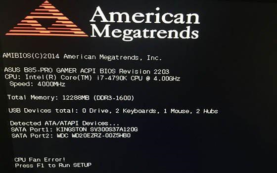 “CPU fan error”,这是由于主板自检时未检查到CPU风扇的转速造成的,开机观察CPU风扇的电源是否错误的插到了CHA_FAN的位置,正确的位置是CPU_FAN。如果不是用的原厂风扇,也可能因为转速低导致检测错误,可以根据自己主板的BIOS版本,查找CPU风扇的相关设置,把最低转速限制提高。