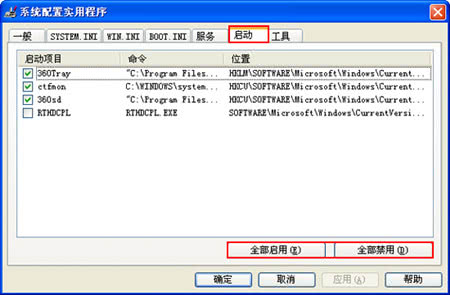 首先,通过点击“开始”,“运行”,输入“msconfig”回车,打开“系统配置实用程序”。选择“启动”标签页,在下面的启动信息中,除了ctfmon.exe、rundll32.exe,显卡驱动,声卡驱动必须保留之外,其他的第三方程序都是可以禁用的,可以参照下图进行更改。