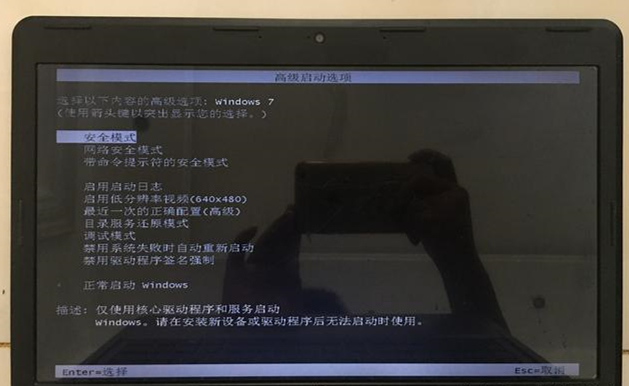 如上图蓝屏无法进入系统,我们记录下蓝屏的代码字符组gjs89056.sys(使用手机拍摄记录代码)。我们这时只能强制关机或重启了,我们强制重启电脑,屏幕出来的一瞬间直接一直按F8选择安全模式进入。